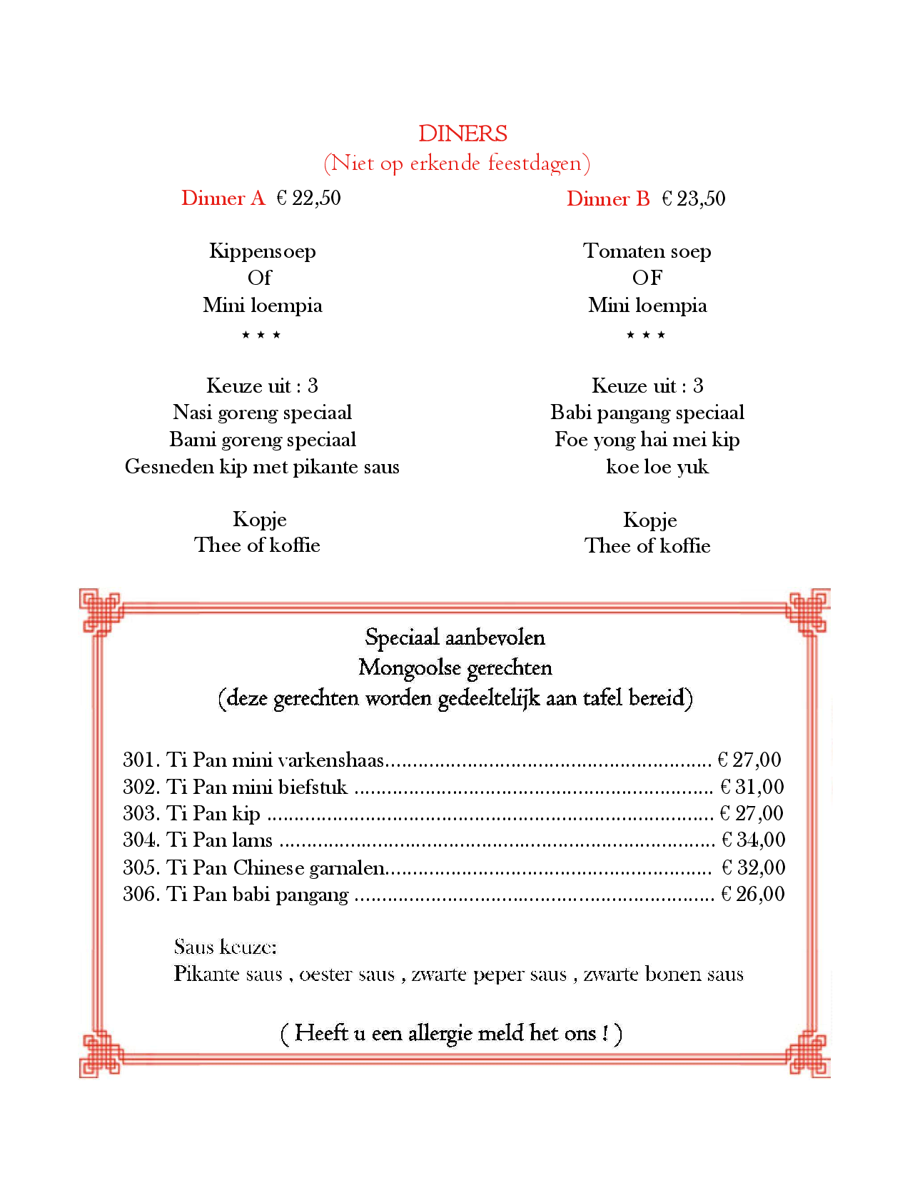Een keer kiezen uit onderstaande gerechten.