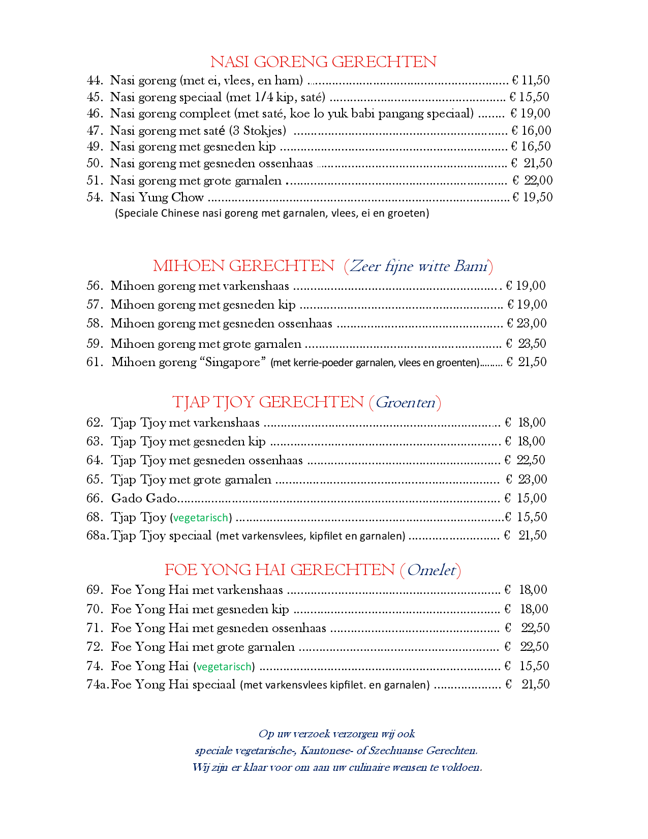 Met Mihoen of Chinese bami € 4,00. Met Nasi of Bami € 0,50 extra. Selecteer dit bij "EXTRA'S".electeer dit bij "EXTRA'S".